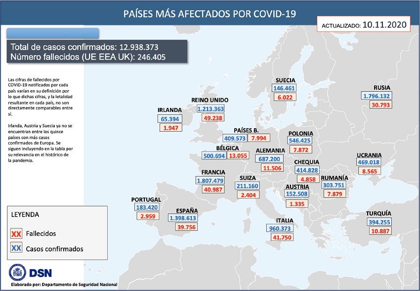 Según el último balance oficial, ofrecido por el Centro de Coordinación de Alertas y Emergencias Sanitarias (datos consolidados a las 14.00 horas del 10 de noviembre), se han notificado, hasta el momento, un total de 1.398.613 casos de COVID-19 y la cifra total de fallecidos es de 39.756.