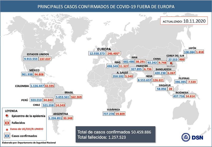 Según la OMS, a nivel global hasta el día de hoy se han notificado al menos 50.459.886 casos y 1.257.523 fallecidos. Los países de fuera de Europa que han registrado más casos son: Estados Unidos (9.913.553), India (8.553.657) y Brasil (5.653.561).