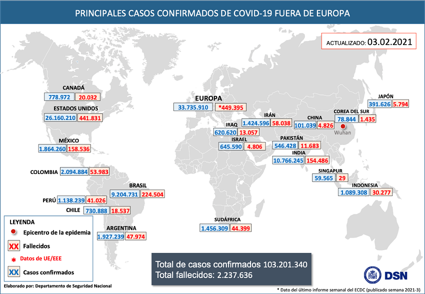Según la OMS, a nivel global hasta el día de hoy se han notificado al menos 103.201.340 casos y 2.237.636 fallecidos. Los países de fuera de Europa que han registrado más casos son: Estados Unidos (26.160.210), India (10.766.245) y Brasil (9.204.731).