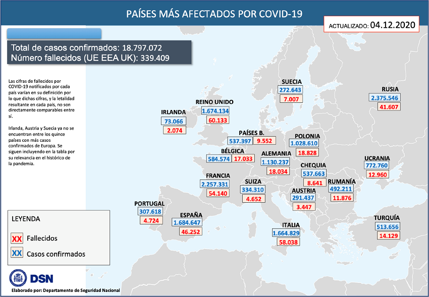 Según la OMS, a nivel global hasta el día de hoy se han notificado al menos 64.350.473 casos y 1.494.668 fallecidos. Los países de fuera de Europa que han registrado más casos son: Estados Unidos (13.882.249), India (9.534.964) y Brasil (6.386.787).