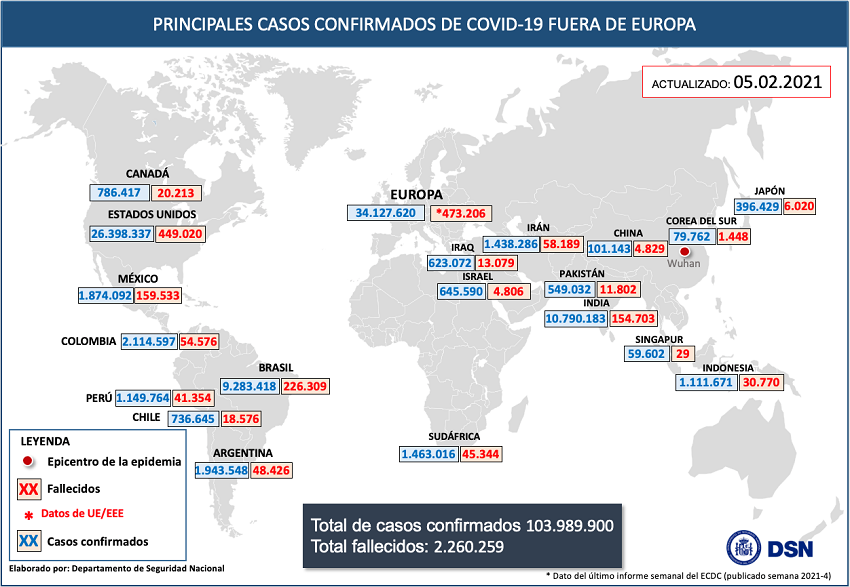 Según la OMS, a nivel global hasta el día de hoy han sido notificados al menos 103.989.900 casos y 2.260.259 fallecidos. Los países de fuera de Europa que han registrado mayor número de casos son: Estados Unidos (26.398.337), India (10.790.183) y Brasil (9.283.418).