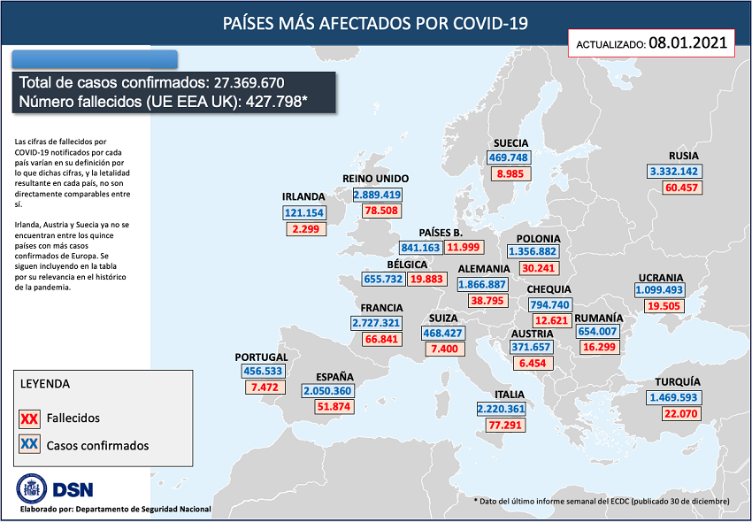 Hasta el día de hoy se han notificado al menos 27.369.670 casos confirmados. Los países con más casos notificados son: Rusia (3.332.142), Reino Unido (2.889.419), Francia (2.727.321), Italia (2.220.361), España (2.050.360) y Alemania (1.866.887). Según el Centro Europeo para la Prevención y Control de Enfermedades (ECDC), el total de fallecidos, de acuerdo con el informe publicado el 30 de diciembre), es de 427.798 (área UE/EEE y Reino Unido). El país con mayor número de fallecidos es Reino Unido (78.508) seguido de Italia (77.291), Francia (66.841), Rusia (60.457) y España (51.874).