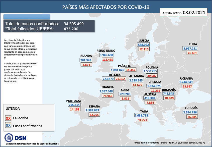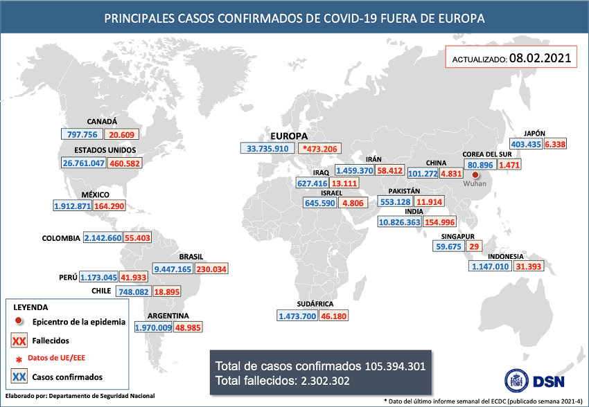 Según la OMS, a nivel global hasta el día de hoy se han notificado al menos 105.394.301 casos y 2.302.302 fallecidos. Los países de fuera de Europa que han registrado más casos son: Estados Unidos (26.761.047), India (10.826.363) y Brasil (9.447.165).