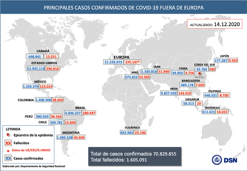 Según la OMS, a nivel global hasta el día de hoy se han notificado al menos 70.829.855 casos y 1.605.091 fallecidos. Los países de fuera de Europa que han registrado más casos son: Estados Unidos (15.932.116), India (9.857.029) y Brasil (6.836.227).