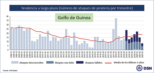 El Golfo de Guinea se mantiene como el principal foco de ataques relacionados con piratería marítima del mundo. En los últimos 10 años, estos delitos han aumentado de forma continuada en la región, una tendencia contraria a lo que ocurre en otras áreas como el Golfo de Adén en la costa de Somalia. (Figura 1 y 4). Entre enero y septiembre del 2020, el 95% del total de secuestros de tripulación de todo el mundo se registró en el Golfo de Guinea, con un incremento del 40% respecto al mismo periodo del año anterior.