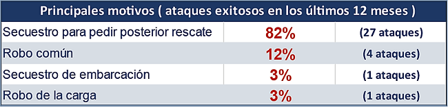 Los principales objetivos son buques petroleros, de carga o incluso plataformas petrolíferas, y la motivación fundamental es el secuestro de la tripulación para pedir un rescate posterior (un 82% de los ataques), seguido del robo de bienes de la propia embarcación o incluso de la tripulación. (Figura 3).