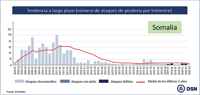 Figura 4: Tendencia a largo plazo de las actividades relacionados con la piratería (por trimestre 2008-2020) en Somalia